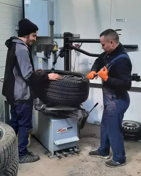 Montarea anvelopelor se face cu utilaje profesionale și personal specializat.