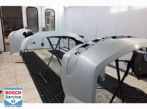 Pregătirea suprafeței, izolare, aplicare grund, cabină de vopsit cu control al temperaturii și particulelor, identificare exactă cod culoare din sistem Bosch.
