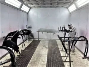 Vopsirea propriu-zisă are loc în cabină profesională cu atmosferă controlată, care elimină impuritățile din aer și asigură o uscare optimă, la temperaturi constante.